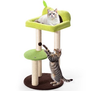 Add playful charm to your home with this avocado-themed multi-level cat tree, perfect for climbing, scratching, and lounging. Durable sisal posts keep claws healthy while protecting furniture, and a soft plush perch offers cozy naps. A hanging bouncy ball sparks endless play, while the sturdy base ensures safety. Compact yet spacious, it’s ideal for keeping your cat active, happy, and stylishly comfortable indoors.