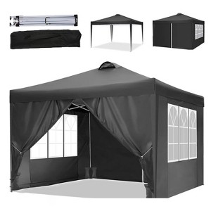 This attractive 10' x 10' SUGIFT Canopy Tent provides the perfect shade solution for outdoor events like camping, parties, and commercial use. Constructed from durable powder-coated steel and high-quality waterproof Oxford fabric, it withstands moderately severe weather conditions. The easy-to-set-up folding design includes a carrying bag for portability, making it perfect for any outdoor activity. The canopy comes with 4 sidewalls, 2 with windows and 2 with zippers, providing versatility, privacy, and protection from the elements.