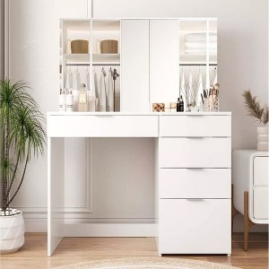Transform your beauty or workspace with this chic, multifunctional vanity table. Designed for both style and utility, this modern white vanity table features a spacious worktop, a large frameless mirror, and five drawers, providing ample storage for cosmetics, jewelry, and accessories. Measuring 38"L x 16.9"W x 53.8"H, this table is crafted from sturdy, EPA-grade particleboard, ensuring durability and longevity. Perfect for bedroom, bathroom, or studio use, it seamlessly transitions from a makeup station to a functional desk or stylish nightstand.
