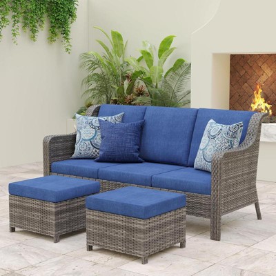 SUGOLD Hand Woven Wicker Patio Conversation Set with Blue Cushions – 3-Piece Outdoor Sofa Set with 2 Ottomans for Backyard & Garden