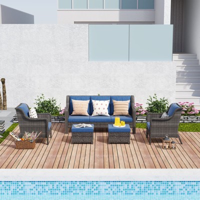Introducing our exquisite 5-person handwoven wicker patio conversation set ¨C a perfect blend of fashion and durability, taking your outdoor experience to new heights all year round. This set includes 2 single chairs, a 3-person sofa and 2 ottomans making it an ideal choice for sunrooms, gardens, balconies, and poolside areas. Crafted with premium PE wicker, it offers sun protection, waterproofing, rust resistance, and scratch resistance, all while boasting a unique and exotic appearance. The 4-inch thick waterproof seat cushions and plush backrest cushions provide a comfortable seating experience. Easy to assemble with low maintenance costs, this furniture set ensures you won't have to worry about cracks, splits, or aging. Enhance your outdoor space with our premium handwoven patio conversation set and create a cozy and inviting atmosphere.