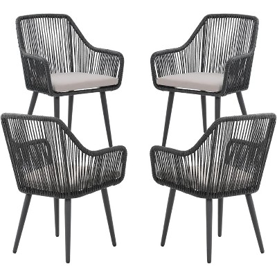 ¡¾Weather Resistance Wicker Material¡¿: This set of outdoor wicker chairs is made of all-weather hand-woven PE rope rattan and sturdy rust-free powder-coated iron frame. Each chair can hold up to 350 lhb, which provides you with a durable wicker seat that will last you for years to come. ¡¾Ergonomic Comfort¡¿: This dining chair features a curved high back design to provide some support for the back when you sitting, which helps to relieve the spinal pressure. Reclining armrest also provides a comfortable place to relax your arm, and is also more ergonomic. Let you sit comfortable. ¡¾Thick&Washable Cushion¡¿: These outdoor rattan dining chairs are equipped with light gray cushions filled with flat cotton. The polyester fabric cushion cover adds a zipper design for your daily removal and cleaning. While providing a comfortable seating position, it also facilitates daily maintenance. ¡¾Versatile Application¡¿: This set of outdoor wicker chairs can be used with other products such as outdoor fire pits and dining tables. It also makes this chair set a very practical matching supplies for outside lawn, garden, yard, front porch, and even indoor room decor. ¡¾Package & Dimension¡¿: Dimension of single patio dining chair: 24.8"¡Á25"¡Á34.25" (W x D x H). This outdoor seating set is packaged with 4 armchairs. Simple assembly required. (Items may slightly differ from photo in terms of color due to the lighting during photo shooting or your monitor's display)