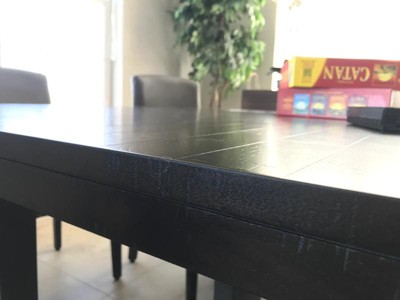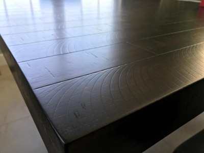 First off - this is a great looking table, however the description says "Solid Wood Table Top" and once we unboxed and got it setup we realize the table top is definitely NOT "real" solid wood but a laminated wood covering with a "scraping" to make it look like solid wood boards. I felt deceived as we are replacing a similar laminated table where the laminate does not fare well with hot plates/pots/pans etc. which leave white marring.
