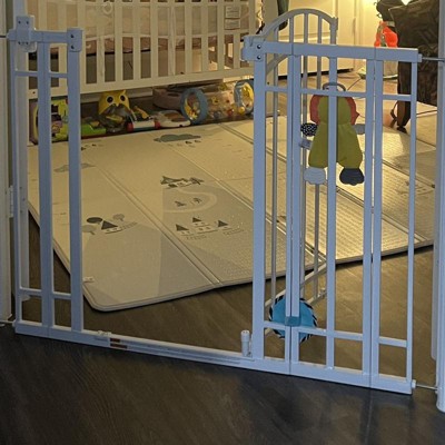 This gate was easy to set up and fit our daughter’s room entry (french doors). Appears to be sturdy and the door is baby proof!