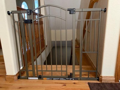 We just bought this gate to keep our great granddaughter from falling down the stairs. The install went easily and quickly and it is quite sturdy and looks great! Then we discovered we had forgotten about the cats whose litter box is downstairs on the other side of the gate! Rather than take the gate down and return it - we took the smaller left-over panel and the larger panel down to a local welder who modified the larger panel with a pet pass through. A bit of touch-up paint and a re-install and it works great - and looks great!