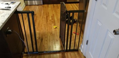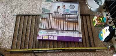 Keep your loved ones safe and secure in style with the Ingenuity Thruway 72XW Series Metal Expansion Extra-Wide Safety Dog and Baby Gate. Measuring 36" tall, this bronze metal safety gate conveniently helps contain children and pets while complementing your home decor. A variety of included extensions help you configure the ideal setup for expansive spaces between 44" and 72" wide, perfect for extra-wide doorways. Install it in hallways or doorways with ease thanks to the included hardware kit (not made for top of stairs use). Recommended tools for installation (not included): drill, screwdriver, pencil, measuring tape.