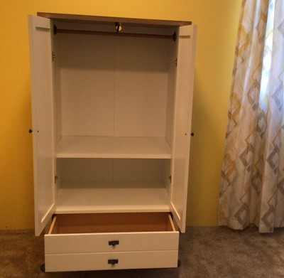This armoire was a little tricky to assemble with a few gaps in the instructions. The drawer didn't piece together perfectly and as a result, doesn't slide in and out very smoothly. A few of the armoire pieces arrived with some damage. There is a large gap between the doors when the cabinet is closed.