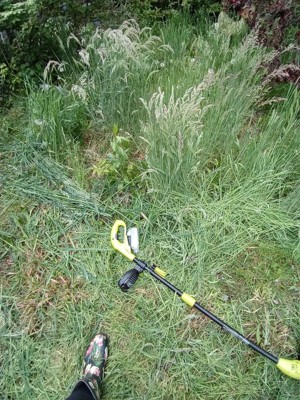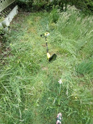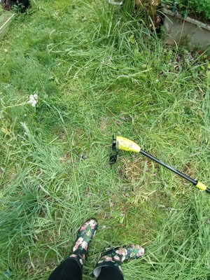 I finally was able to use the grass trimmer from my Sun Joe 24V-GT3MAX-LTEkit. Wow! After reading some of the reviews, I was thinking about asking for a refund or selling it. But I decided to give it a try. I am so glad that I kept it. I have a spinal injury which got worse after a car accident. I was bedridden for close to a year. So this is my first time trying to do anything in the yard since. We've had lots of rain. I wanted to purchase a more powerful battery and some additional blades. Guess what? Only one light was slightly dim on the battery and I did the front and back. I didn't have much to do on the front, however. The back had a lot including taller grass, plant borders, tomato cages, water hose guides, motion lighting, etc. I was still good. I broke about 2 maybe 3 of the blades after getting too close to the tomato cages several times. Not as hard to put on as restring wire. The trimmer did not pull on my back much. It didn't take me long at all. I even had time to pull some weeds using my new stool. I just need to make sure I keep extra blades just in case. But I'm getting better with that. I did learn that I must remember to keep swinging the trimmer back and forth in order for it to work it's best. Pics show just a couple minutes or less into trimming. I laid the trimmer down beside the grass to show that this was actually what I'd used.