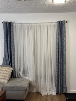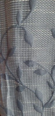 [This review was collected as part of a promotion.] Beautiful design, not overwhelming, just looks sleek. A light blue/gray and silvery color that just is so elegant and I personally think goes great with my light green walls, makes the room feel brighter. Has a kind of felty texture white fabric on the back for light blocking and I would say it blocks 80% or more of the light for room darkening. Grommets were easy to put on and slide so smoothly. I think they look so pretty framing my sheers and letting some light in as well! If putting them up on a sliding door I would recommend having 3 or 4 panels for full coverage as they are a little narrow for that but they are perfect for the average window. I would recommend these.