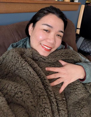 [This review was collected as part of a promotion.] Soo soft and big, I really love how it has a spot for your feet! My feet are always cold and this truly helps them feel nice and cozy. Truly obsessed and can’t wait for weather to get colder to start using more often.