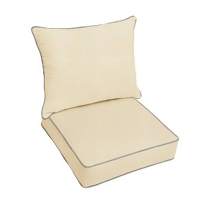 Sit in cool comfort in any outdoor setting on this Sunbrella canvas beige with charcoal gray indoor-outdoor deep seating pillow and cushion set from Mozaic. The contrast piping of the durable weather-, fade-, and UV-resistant fabric adds a touch of style and panache to your deck or patio. You and your loved ones will look forward that much more to all your outdoor backyard activities.