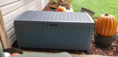 - DECK STORAGE BOX: Beautiful wicker plastic outdoor box has a 73-gallon capacity for patio, deck, yard, porch, garage, and shed storage!