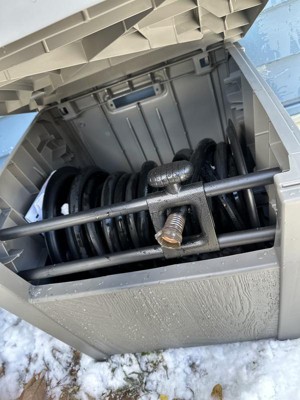 This hose storage is missing one important feature. There is no way to hold the container still while you are winding the hose so it slips all around. Others that I have had have a piece that you can step on to hold the unit still while reeling in the hose. I purchased another one that costs less at another store. I would not buy this again.