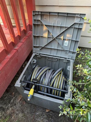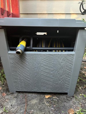[This review was collected as part of a promotion.] I love that this container is an easy way to keep my garden hose neatly stored, better protected, and out of sight while not in use. After connection, reeling the hose in is relatively easy with the included hand crank on the side of the box and a sliding hose guide on the front. Removing the hose is even easier as you simply grab the end and pull out gently to unwind as much or as little hose is needed for the task. I use a 100 feet length hose and it fits fine on the reel with room for more if I later add an even longer hose. It makes good end to end connection without any water leakage. Box also has a hinged lid that can easily be lifted to see inside or address any coiling issues. I especially like the attractive wood-like pattern design that looks nice in my outdoor space. The container is lightweight but comes with access holes to stake it down if you prefer that it be more sturdy and stationery. Could use a little design improvement as there is a gap on each end between the reel and the inside box walls that can catch the host and prevent further winding. Hose also does not wind evenly onto the real on its own without continual guidance from the user. I do quite a bit of watering throughout my yard on a regular basis so I do like that this is a durable hose storage pot that is built to last and I do not have to leave my hose laying about.