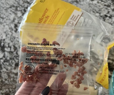 green cabbage, sweet onion dressing (sugar, vegetable oil [canola and/or soybean oil], water, distilled vinegar, less than 2% of egg yolk, egg whites, salt, dried onion, modified corn starch, lemon juice concentrate, dried garlic, acacia gum, natural flavor, paprika extract [color]), green leaf lettuce, sunflower kernels (sunflower kernels, sunflower oil), red cabbage, carrot, kale, uncured bacon topping-no nitrites or nitrates added except for those naturally occurring in sea salt and cultured celery juice (pork, water, sea salt, sugar, natural smoke flavor, cultured celery juice, natural smoke flavor added), green onion.' '