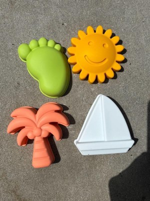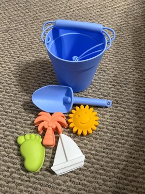 [This review was collected as part of a promotion.] This is a silicone set of beach boys, with a bucket, shovel, and four sand toys to make shapes in the sand. The colors are bright, and I do like that the pieces are flexible. That helps make packing a lot easier. One complaint is that the handle for the bucket is untied at one end, so I can see my kids taking that off and losing it easily. Also, while the shovel is a little firmer, I think you can only use this on soft sand. It's not going to work in dirt or harder sand.