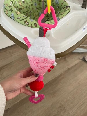 [This review was collected as part of a promotion.] Super cute girls baby toy. It crinkles. It’s a milkshake which is adorable. It massages gums. It’s perfect to put on the car seat to play with. It has a hook for that.