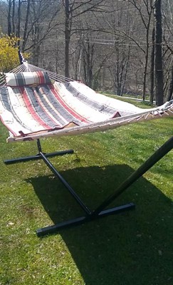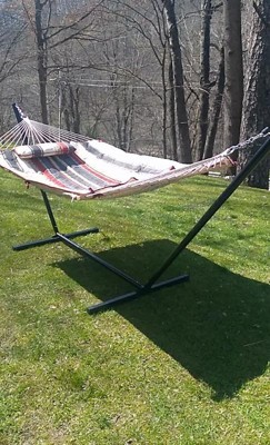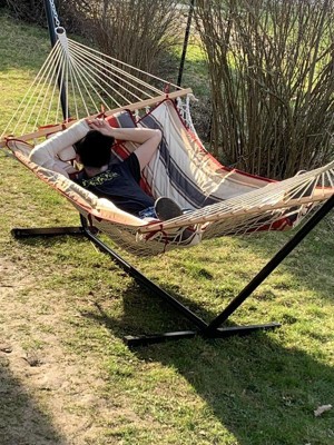 [This review was collected as part of a promotion.] This Sunnydaze Lakeview Cotton Rope Hammock with 12 foot stand is fantastic. it is wider than expected which was a welcome surprise. The stand is very easy to set up and hanging the hammock itself took very little time. The rope hammock is very well made as are the pad and pillow that accompany the unit. I am beyond pleased with this hammock set.