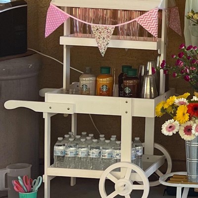 Super cute!! Originally I had considered using it for a flower/bloom bar at my daughter’s bridal shower, but it was way too small and short for that use! It was too cute not to keep, so I utilized it at the bridal shower brunch as a coffee cart!! It was perfect, especially with all the extra shelves!! This cart is definitely smaller than I expected, even after reading all the measurements carefully before purchasing. So definitely read the measurements before purchasing to see if it will work for your needs! For height estimation, picture it perfectly sized for a 5-8 year olds. It’s perfect for a child’s lemonade stand or decor in a kids room or playroom! It’s not plastic! Seems like value painted wood-esque. Solid, but was a little considered about how waterproof it might be. Cheap woods don’t tend to handle water well. That would be my concern for use with plants. Would need to have drain trays and be careful when watering not to bubble paint or make shelves swell.
