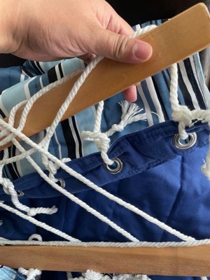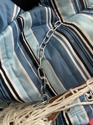 [This review was collected as part of a promotion.] This Sunnydaze 2-Person Quilted Fabric Double Hammock with Pillow is a really nice hammock. The material is soft and high quality. It is constructed very well with tight stitching. It has the chains to hang it but no hooks so you will have to supply the other hardware yourself. There is a little bit of a soft padded feel to the hammock which feels just heavenly. It has a soft pillow that attaches for even more comfort. Spreader bars hold the hammock open but it has plenty of give so you sink into it for the cozy experience you expect from your hammock. The print and color is vibrant and beautiful. I love the hues of the blue in this item--it gives me a summery, beachy vibes. I am very happy with this product.