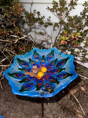 • ELEGANT GLASS DESIGN: This peacock bird bath features a vibrant feather design. It includes a sturdy iron deck clamp in black as well as a three-pronged staked pole in a copper color.