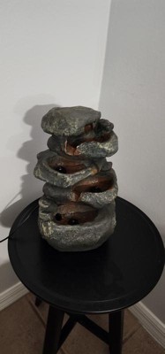 Made from durable polyresin and fiberglass to look like real stacked rocks, this rock waterfall fountain creates the striking views and soothing sounds of nature. This small fountain is a wonderful accent for any room in the home. Its durable material mimics the look of natural stone, but with a convenient lightweight and easy-to-maintain construction. The included electric submersible fountain pump allows the gently flowing water to trickle down from the top tier to collect in the bottom pool where it continuously circulates back through the fountain. This indoor, tabletop fountain features padded feet to protect surfaces against scratching. It also features an authentic, natural coloring and LED lights on the 1st, 2nd, and 3rd tiers so everyone can appreciate this tabletop fountain's beauty during the evening, even as the sun goes down. This decorative fountain can be enjoyed on a desktop, entryway table, end table or anywhere within the comforts of one's home or office.