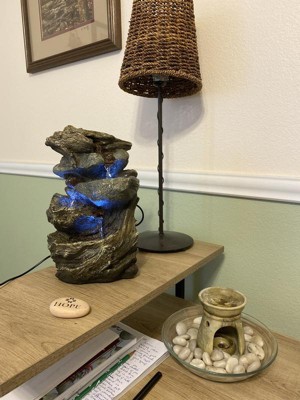 [This review was collected as part of a promotion.] I absolutely love this rock waterfall perfect size for any table top or bed side table easy to use just add water and plug in even flow of water gives you a calm feeling the lights are added tough to make your space feel relaxed the rocks are realistic and beautiful light weight and easy to move from place to place to enjoy any room in your home