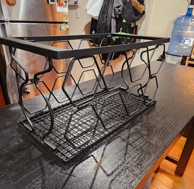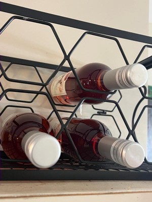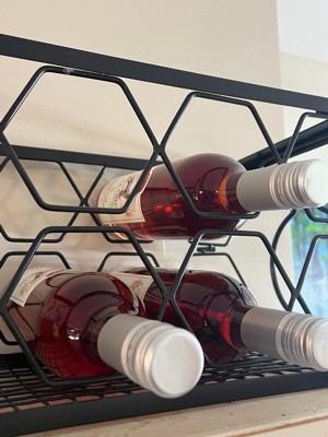 Organize and display up to 8 bottles of wine with this small wine bottle rack. The metal wine rack features 8 hexagon-shaped slots designed to fit 750 ml bottles, offering space for storing white wine and red wine of all kinds. The wine bottle organizer can be placed on a tabletop, on a kitchen countertop, in a pantry, or in a wine cellar to keep bottles of wine conveniently located. Made from durable iron, this tabletop wine rack features a food-safe, black finish and metal wire design for a modern look. It's easy to store the rack when not in use too. The rack folds down flat for compact storage. Just push in the sides and press downward on the top of the rack to collapse it in seconds.