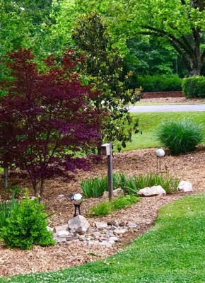 Purchased two gazing balls and added to island. Both are shiny and compliment the greenery, red maple and irises very well!