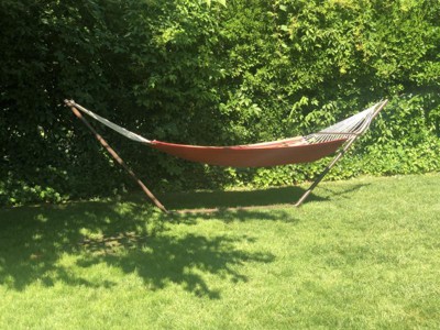 This is much sturdier than the Threshhold hammock stand, but it's also about 3 feet shorter.. which means that the hammocks you buy at Target won't fit it. It's about 3 feet too short.
