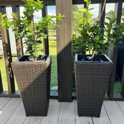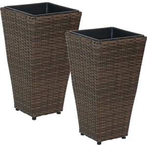 Add an elegant touch to the front porch, patio or deck with these tall, rectangular outdoor planters. This pair of tall stately outdoor patio planters is great for placing besides a front door or in the entryway to showcase a variety of beautiful plants and florals, sure to complement the scenery. These durable modern planters are made from sturdy yet lightweight polyrattan for a basket-like appearance and long-lasting durability. However, unlike real rattan, polyrattan won't chip easily and stays smooth to the touch. Both planters features an included planter that measures 9.25" H, 10" W on top, and can hold 13.3 quarts of soil. The planter case with the polyrattan design measures 20" H and 11" W on the top. These beautiful planters are sure to stand tall wherever placed. Place these baskets together in any sunroom, entryway, kitchen, or living room to create a cohesive look, or place them separately to spread the beautiful potted plants around!
