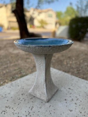 Add a dramatic centerpiece to the patio or garden with this striking outdoor bird bath. Made from frost- and UV-resistant ceramic to resist the outdoor elements, this small decorative bird bath features a shiny, glazed blue bowl and a unique, one-of-a-kind lava surface treatment for a distinct look. The bowl is capable of holding up to 8 cups so there is plenty of water for feathered friends to splash and preen. Assembling this bird bath is easy, Simply place the bowl onto the pedestal. No tools or hardware are required for assembly. This elegant bird bath is a stylish addition to the garden, patio, or front porch. To attract more birds, try to place this bird bath in a slightly shaded area with a nearby tree or bush shelter.