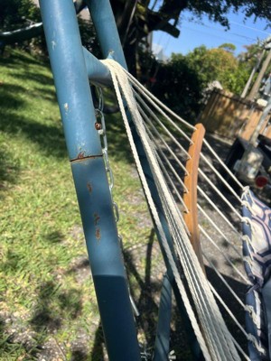 [This review was collected as part of a promotion.] It’s been 6months and it’s worn out and rusted. The wood is splitting, the frame is rusted, and the hammock has completely faded in color.