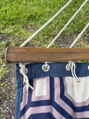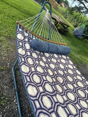 Sunnydaze Outdoor 2-Person Double Polyester Quilted Hammock with Wood Curved Spreader Bar and Matte Blue Steel Stand - Navy and Gray Tiled Octagon