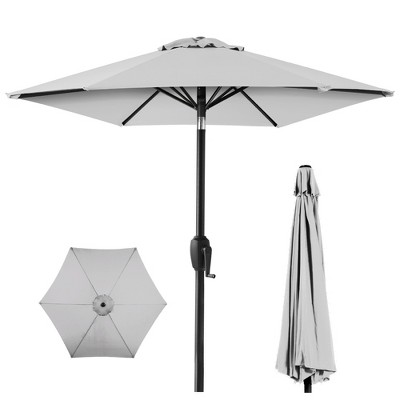 Stay cool and comfortable under this durable outdoor market umbrella. Designed to provide ample shade for tables ranging from 42 to 54 inches, this large patio umbrella offers a stylish and functional addition to patios, decks, and outdoor seating areas. The sturdy aluminum pole features a rust-resistant, powder-coated finish, ensuring long-lasting use, while steel ribs add extra stability to the canopy. The 100% polyester fabric shade is built to withstand outdoor conditions, offering reliable sun protection and a fresh, clean look season after season. Operation is simple with a convenient crank handle that allows for easy opening and closing. A push-button tilt function makes adjusting the angle of the shade effortless, ensuring better coverage as the sun moves throughout the day. Lightweight yet strong, this patio umbrella with tilt is easy to assemble and reposition as needed. With a 1.5" diameter pole, use the umbrella with any patio table (not included) with an umbrella hole. Whether used for casual outdoor dining or relaxing in a backyard setting, it delivers both shade and style with ease.