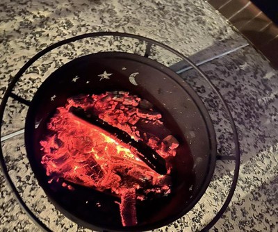 Love this fire fit. It’s so beautiful with the stars and moon design. It’s not completely black but I actually like the rusty color it came as. I added sand at the bottom so the fire wouldn’t ruin it over time as well.