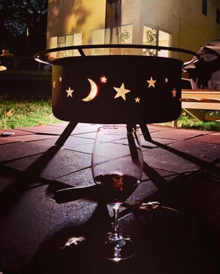 I really like this fire pit for use in my small backyard with room for 4 chairs around it. I love the moon and star decorations and appreciate how portable it is. I wish the weave on the screen was a bit tighter because sparks still fly out through the screen. Highly recommend!