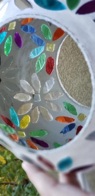 [This review was collected as part of a promotion.] I love the mosaic bird feeder, I hang it in my fruit tree and the sun hits it and it shines! Beautiful colors!!