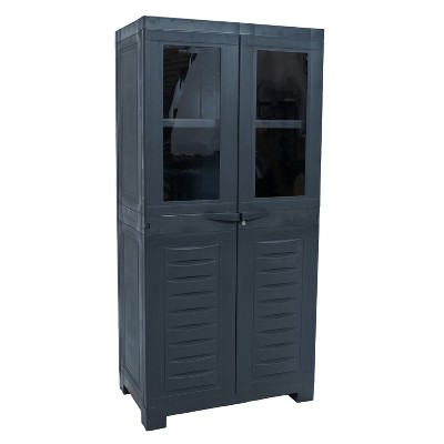 Whether displaying books in the living room, creating a display of collectible items, organizing tools in the garage, or storing cleaning essentials in the closet, the adaptability and durability of this utility storage cabinet make it a reliable choice. Crafted from polypropylene, this versatile garage tool storage cabinet won't rust or peel no matter where it's used. With three adjustable shelves, it provides a customizable storage solution to accommodate various household items. The lockable doors ensure the contents inside stay out of sight and secure, giving peace of mind when storing chemicals or cleaning products. Use the two included keys to unlock access to the items placed inside. The doors feature 4 plexiglass windows to provide a clear view of the items inside. This cabinet withstands the test of time due to the durable material, making it a great option for many locations. Use the cabinet in the shed, garage, basement, mud room, and more to keep a variety of items neatly organized.
