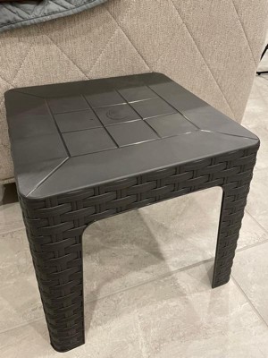 [This review was collected as part of a promotion.] This is the perfect size side table for outside! Study and stable! Perfect for some afternoon drinks by the pool! Great addition to your outdoor patio furniture collection. - Dark brown sturdy heavy plastic - wicker like pattern - smooth top