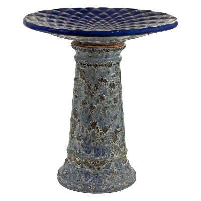 Add a dramatic centerpiece to the patio or garden with this striking outdoor bird bath. Made from frost- and UV-resistant ceramic to resist the outdoor elements, this decorative bird bath features a shiny, glazed finish in turquoise for a unique look. The bowl is capable of holding up to 6 cups so there is plenty of water for feathered friends to splash and preen. The wide bowl ensures that there is room for all sorts of birds to gather. Assembling this bird bath is easy, simply place the bowl on top of the pedestal. No tools or hardware are required for assembly. This elegant bird bath is a stylish addition to the garden, patio, or front porch. To attract more birds, try to place this bird bath in a slightly shaded area with nearby tree or bush shelter.
