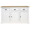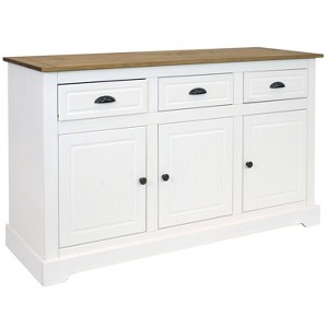 Store kitchen supplies or provide a convenient surface for serving snacks and drinks with this elegant sideboard cabinet. Made of solid pine, this classic furniture piece features a two-tone color scheme with a wood tabletop and a white finish. Its retro drawer pulls and molding will complement a variety of decor styles and furniture pieces. The drawer pulls, doorknobs, and hinges are made from zinc alloy. It features three drawers with steel drawer slides for smooth opening and closing and three cabinets for an abundance of storage space. Plus, the cabinets feature an adjustable, built-in storage shelf for even more organization opportunities. This versatile piece can be used in the kitchen or dining room to store silverware, flatware, or pots and pans, or place this cupboard in the utility room to store cleaning supplies, craft supplies, hand tools, and other knickknacks.