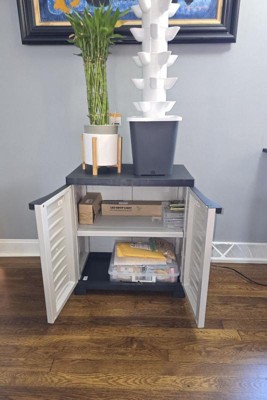 [This review was collected as part of a promotion.] The Sunnydaze Plastic Garage Storage Cabinet with adjustable shelf is easy to assemble. The back panel needs to be put on with the decorative panel facing inward, or the bottom piece will not fit. Other than that, all the pieces snap together, and no tools are needed! The adjustable shelf is great, so you can customize it for your storage needs. I'm using this as storage for my Hydroponics set up for growing veggies indoors. It's a great size to store seeds and extra lights in.
