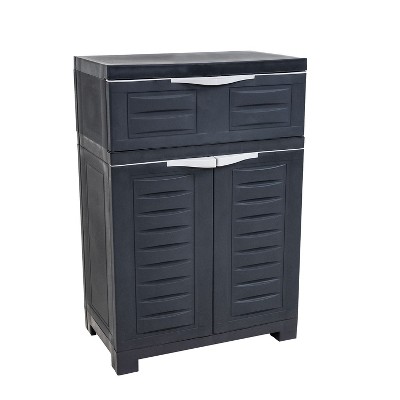 Make home organization simple by keeping household necessities neatly contained in this storage cabinet with adjustable shelves. The laundry room cabinet with doors features an adjustable shelf with a drawer on the top, providing plenty of space for storing cleaners, tools, office supplies, games, and more. Made from durable polypropylene, this plastic cabinet storage unit is designed for use indoors. The strong plastic material won't crack or peel. The shelf can be adjusted in 4" increments to accommodate various-sized items, like tall bottles of cleaner, planters, hoses, and other odds and ends. The opaque design of the cabinet keeps its contents out of sight for a neat and tidy look in any room. Whether it's used in the shed, basement, mudroom, laundry room, office, or elsewhere, this storage cabinet keeps a variety of items neatly organized and ready for use.