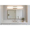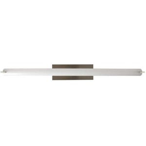 Transitional 37.25" vanity light with a Bright Satin Nickel finish and integrated 30W LED for efficient, even illumination. Damp-rated and Energy Star certified, it complements nearly any bathroom décor and supports dimming for the perfect ambiance.