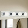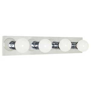Contemporary Hollywood-style vanity bar in a polished chrome finish with four medium-base sockets. Dimmable compatible, functional over-mirror illumination in baths and hallways.
