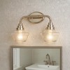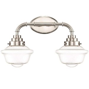 Elegant transitional vanity with a Bright Satin Nickel finish and clear glass shades for crisp, stylish illumination. Ideal over bathroom mirrors, it uses two 60W incandescent bulbs to deliver balanced, everyday lighting.