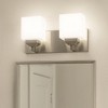 A clean, modern 2‑light LED vanity with frosted glass shades and a Bright Satin Nickel look that delivers soft, even illumination. Designed for damp locations, it provides reliable, energy‑saving performance with long LED life for everyday use.