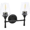 A modern 2-light vanity in a sleek black finish with clear wine-glass style shades, perfect for over-mirror lighting. Damp-rated and dimmer compatible, it brings adjustable ambiance to contemporary, farmhouse, or industrial bathrooms. Durable iron and glass construction with reversible up- or down-facing installation.