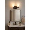 An elegant, damp-rated wall-mounted vanity light in a rich Provincial Bronze finish with opal glass shades. Designed for two medium-base bulbs up to 100W each, it adds warm, transitional style over a mirror or above a sink.